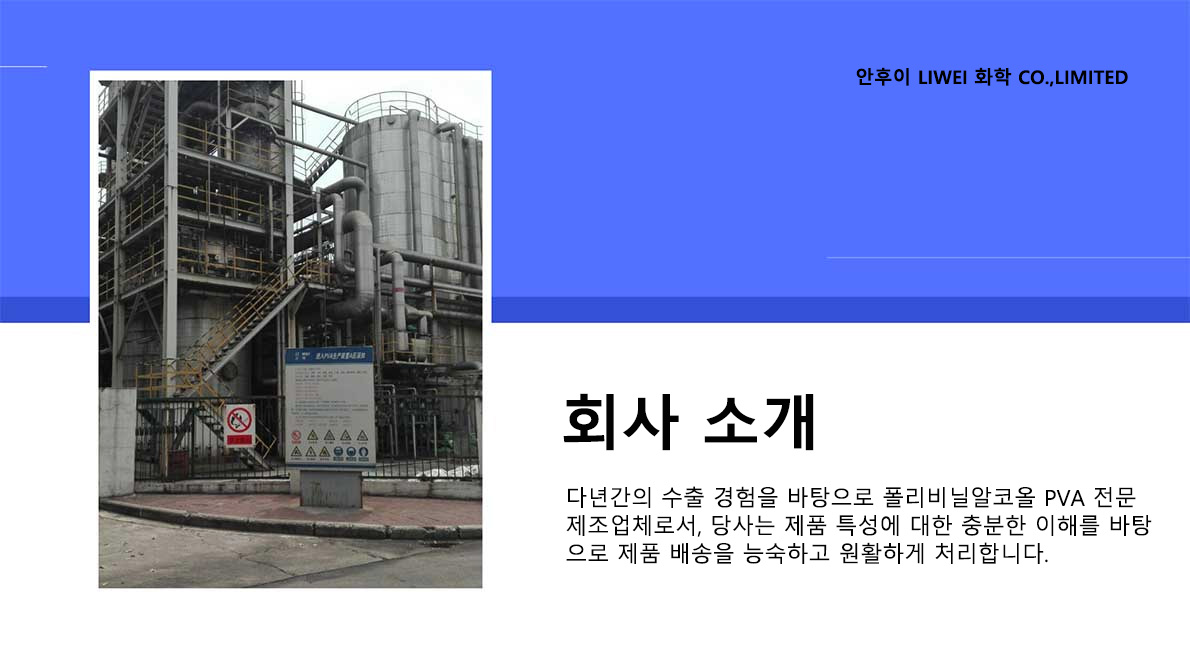 리웨이 PVA는 안후이성 10대 PVA 공장이자 100대 강소 기업 중 하나입니다. 2010년, 리웨이 PVA는 선진적이고 고도의 기술력을 갖춘 기업으로 평가받았습니다. 당사는 주로 폴리비닐알코올, PVA, PVA 섬유, 그리고 비닐아세테이트와 같은 PVA 생산 원료를 판매합니다.